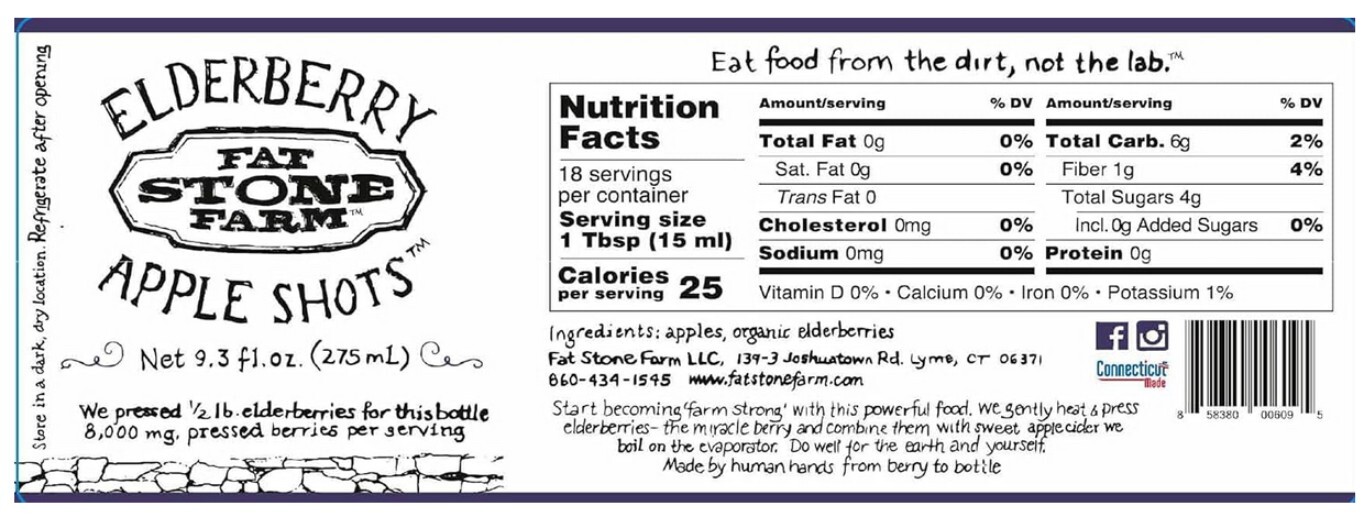 Add our Elderberry Apple Shots (55% pure elderberry juice by volume) to your smoothies, yogurt, sparkling water, cocktails, oatmeal or just sip it straight!