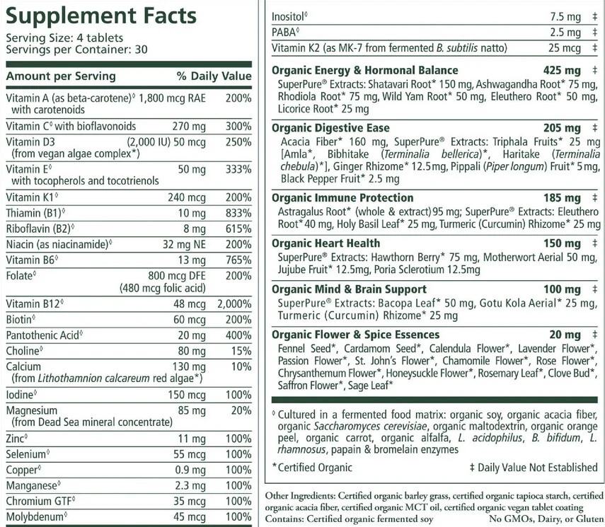 Pure Synergy's Vita•Min•Herb for Women is the premier daily multivitamin available—not only for its organic whole food nutrients but also for its exclusive SuperPure™ organic herbal extracts and spice blend. Relying on traditional herbal wisdom and the best of modern science, the SuperPure™ ingredients in this Pure Synergy women's multivitamin formula have been expertly chosen. They support a woman's needs and sustain healthy energy, hormones, heart, mind, digestion, immune system function, and overall well-being.